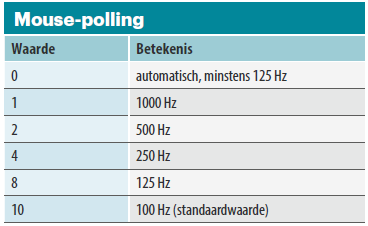 Om met de waarde te experimenteren en de juiste te ontdekken, vervang je het getal 8 aan de hand van de tabel links. Het probleem treedt blijkbaar op bij pollingrates van meer dan 125 Hz. Het nieuwe configuratiebestand zorgt ervoor dat de instelling bij de volgende keer opstarten geladen wordt. Om de waarde zonder reboot meteen aan te passen, laad je de kernelmodule opnieuw met het volgende commando als rootgebruiker:
