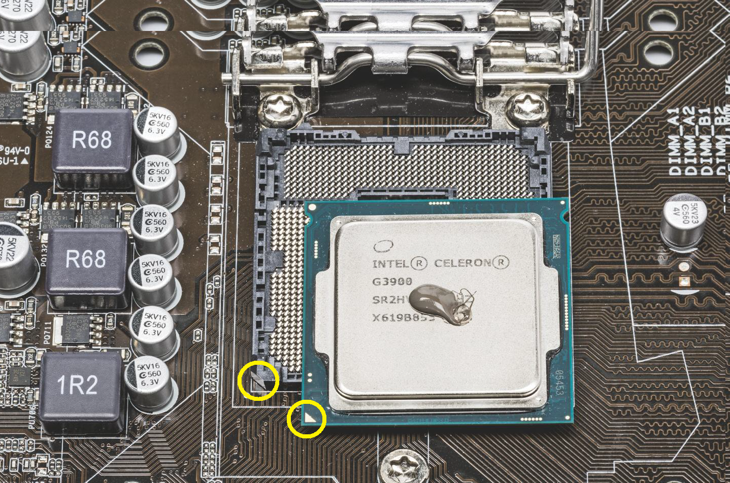 Het kwetsbaarste onderdeel is de processorsocket, vooral bij de platforms die meer dan 1000 contactveertjes hebben voor pinloze processors met een zogeheten ‘Land Grid Array’ (LGA). Veel moederbordfabrikanten geven geen garantie als er veertjes verbogen of vuil zijn. Bij het plaatsen van de processor in de socket moet je het aanraken en vies maken van de gevoelige contactveertjes vermijden. Markeringen (omcirkeld) geven aan hoe je de cpu moet plaatsen.
