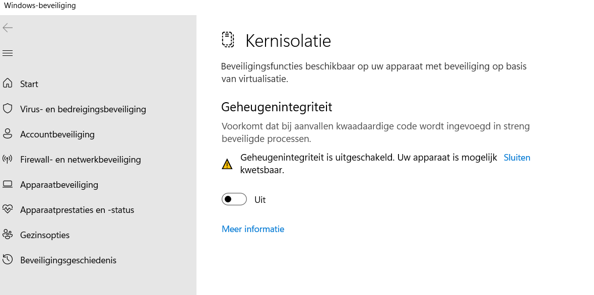 Nadat je op ‘Kernisolatie’ hebt geklikt, wordt er een nieuw scherm geopend. Hierna is het alleen nog een kwestie van Geheugenintegriteit uitzetten.