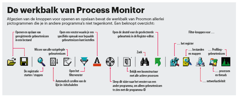 Het gratis programma Process Monitor houdt van Windows en alle actieve toepassingen bij welke bestanden, mappen en registersleutels ze benaderen. Verder monitort de tool al het netwerkverkeer, controleert hij welke processen starten en stoppen en houdt hij nog een aantal andere dingen bij. Je kunt er bijvoorbeeld precies mee uitzoeken waar het bij een programma misgaat vanwege ontbrekende toegangsrechten en waar in het register een bepaalde instelling wordt bewaard. Process Monitor kan zelfs het complete boot-proces controleren. Je moet wel even je weg vinden in het programma. Zo bevat de werkbalk afgezien van de bekende pictogrammen voor openen en opslaan allerlei knoppen die je niet in andere programma’s aantreft. Bovendien zijn Windows en de geopende toepassingen zo actief dat Process Monitor elke seconde honderden gebeurtenissen registreert, zelfs als jij helemaal niets doet. En als je de pc echt gebruikt, levert dat al snel honderdduizenden of zelfs miljoenen gebeurtenissen op. Zulke hoeveelheden kun je niet zomaar bekijken en analyseren.