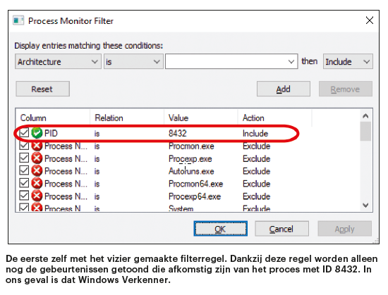 Nu bepalen we de basisinstellingen voor het filter. Daarvoor gebruik je het vizierpictogram: sleep dit met ingedrukte muisknop naar het Verkenner-venster. Zodra hierin een zwart kader verschijnt (waar precies maakt niet uit) laat je de muisknop los. Het lijkt alsof er niets gebeurt, maar aan de filters is nu een nieuwe regel toegevoegd. Die zorgt ervoor dat Procmon alleen nog gebeurtenissen laat zien die betrekking hebben op het actieve proces van Windows Verkenner. Ze worden herkend op basis van de bijbehorende ID (in ons voorbeeld 8432). De eigenlijke regel luidt als volgt: als de proces-ID (‘Column’:’ PID’) gelijk is aan een specifieke (‘Relation’:’is’) waarde (‘Value’:’8432′) moet de gebeurtenis worden weergegeven (‘Action’:’ Include’).