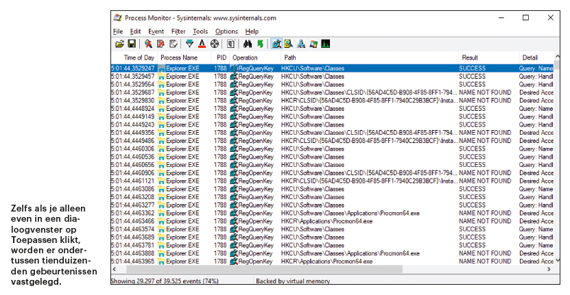 Om greep op de gebeurtenissen te krijgen, gebruik je filters. Soms moet je online onderzoek doen om te ontdekken wat er nu eigenlijk gebeurt. Beter gezegd: de informatie is af en toe zo complex dat je je erin moet verdiepen om het te begrijpen. Het kan er op uitdraaien dat je proefondervindelijk oplossingen moet testen. Maar dat is niet erg, want met geduld en een beetje geluk kom je met Process Monitor vaak tot een goed resultaat.