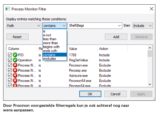 Je weet nu genoeg om verder aan de slag te gaan met Process Monitor. Bekijk nog even op je gemak wat je al weet. In het filtervenster is het de moeite waard om eens te kijken welke opties de keuzelijsten te bieden hebben. Als iets niet duidelijk is, probeer je het door experimenteren te ontdekken.