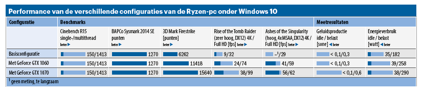 (Christian Hirsch, Alieke van Sommeren, c’t magazine 9-2017) Onderdelen Ryzen-pcOnderdelenOmschrijvingPrijsProcessorAMD Ryzen 7 1700, boxed (YD1700BBAEBOX)€ 330Cpu-koelerScythe Kabuto 3 (SCKBT-3000)€ 40MoederbordMSI X370 SLI Plus (7A33-003R)€ 160Werkgeheugen2 x Samsung DIMM 8GB, DDR4-2400, CL17-17-17 (M378A1K43CB2-CRC)€ 140Grafische kaartGigabyte GeForce GTX 1050 D5 2G (GV-N1050D5-2GD)€ 130SsdCrucial MX300 525GB (CT525MX300SSD1)€ 160Behuizingbe quiet! Pure Base 600 zilver (BG022)€ 80Voedingbe quiet! Pure Power 10 400W ATX 2.4 (BN272)€ 60Extra kostenVerzending€ 25 subtotaal hardware€ 1125BesturingssysteemWindows 10 Home€ 100 Totaal€ 1225OptiesGrafische kaartMSI GeForce GTX 1060 Gaming 6G (V328-012R)€ 320Grafische kaartGainward GeForce GTX 1070 Phoenix GLH (3675)€ 480Harde schijf / trillingsdempend frame / SATA-kabelWestern Digital WD Blue 4TB (WD40EZRZ) / Sharkoon HDD Vibe-Fixer (4044951000029) / SATA-Kabel€ 135 + € 20 + € 4Dvd-branderLiteOn iHAS124€ 20KaartlezerKingston USB 3.0 Media Reader (FCR-HS4)€ 25 Bouwvoorstel Ryzen-pc: technische gegevens en testsTypeRyzen-pcHardware-uitrustingAfmetingen (b × h × d)222 mm x 469 mm x 507 mmKastventilatoren (met regeling)achterkant: 1 × 12 cm (v), boven: 1 × 14 cm (v)Uitbreidingsslots (bruikbaar)1 × PCIe 3.0 x16 (0), 1 × PCIe 3.0 x8 (1), 1 × PCIe 2.0 x4 (1) , 3 × PCIe 2.0 x1 (3), 1 × M.2 (1)Inbouwsloten (beschikbaar)2 × 5,25″ (2), 3 x 2,5″/3,5″ (2), 2 × 2,5″ (2)Display-aansluitingen grafische kaart1 × HDMI 2.0, 1 × DVI-D, 1 × DisplayPort 1.4Aansluitingen achter6 × analoge audio, 1 × USB 3.1 type A, 1 × USB 3.1 type C, 4 × USB 3.0, 2 × USB 2.0, 1 × LAN,1 × PS/2Aansluitingen voor, boven, zijkanten2 × USB 3.0, 2 x analoge audioEnergieverbruik, datatransfersnelheden en geluidsproductieSoft-Off (met ErP) / energie besparen1,0 W (0,5 W) / 2,2 Widle Windows 10 / Ubuntu 17.0435 W / 35 Wbelast: CPU / CPU en GPU117 W / 182 WSsd: lezen (schrijven)535 (522) MB/sUSB 3.1 / 3.0 achter: lezen (schrijven)1010 (1004) / 426 (424) MB/sEthernet: down (up)119 (119) MB/sBoottijd tot loginscherm27 sBeoordelingSysteemperformance: office / rendering / games++ / ++ / – (met GTX 1050)Audio: afspelen / opnemen++ / ±Totaal hardware (waarvan verzendkosten)€ 1125 ( € 25)v werkt ++ zeer goed +goed ± voldoende -slecht –zeer slecht