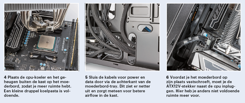 Neem twee tot vier uur de tijd om de pc in elkaar te schroeven. Het enige wat je aan gereedschap nodig hebt is een lange kruiskopschroevendraaier. Koelpasta wordt bij de cpu-koeler meegeleverd. Bij de behuizing en voeding zitten montagemateriaal en kabelbinders. Op de foto’s hieronder staan een aantal tips en punten waar het fout kan gaan afgebeeld. Als er iets onduidelijk is, kun je het beste de meegeleverde handleidingen erbij pakken.