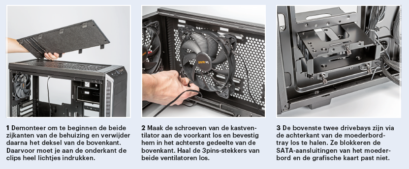 Voordat je de onderdelen gaat monteren, ga je een aantal zaken aan de kast veranderen. De afneembare plastic kap op de bovenkant gaat eraf en de kastventilator aan de voorkant komt op deze vrije plek, zodat hij naar boven de warmte afvoert. Zo verdwijnt de warme lucht van de cpu en grafische kaart wat makkelijker uit de kast. Bij de tests met een ongewijzigde ventilatorconfiguratie hoopte warmte zich op, waardoor de ventilatoren onder belasting sneller moesten draaien en meer geluid maakten.